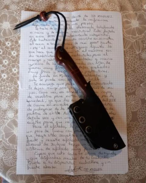Cuchillo nuevo sin estrenar del prestigioso forjador JD Knives, 19,5 de largo, mango 11,5cm, 8cm hoja, 4,5mm grosor. Funda con posiciones múltiples para cinturón.
