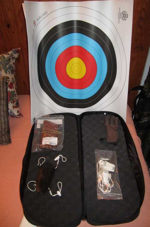 Arco recurvado (el kit que venden en A Alvarez) acompañado de 11 flechas en total, brazalera de cuero además de la que lleva el kit y dactilera de cuero en vez de la de plástico. También doy varias dianas sin estrenar y funda de transporte.