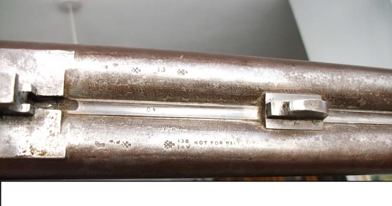 . Me parece que los dos cañones de tu escopeta son distintos. De los dos cañones, únicamente el izquierdo parece ser el que tiene el "choke" al estar marcado con todos estos punzones que lo indican, mientras que el derecho parece no llevarlo, ya que sólamente lleva marcados los dos punzones de Birmingham de las alabardas cruzadas y el nº 13 que sería el calibre del cañón en toda su longitud.