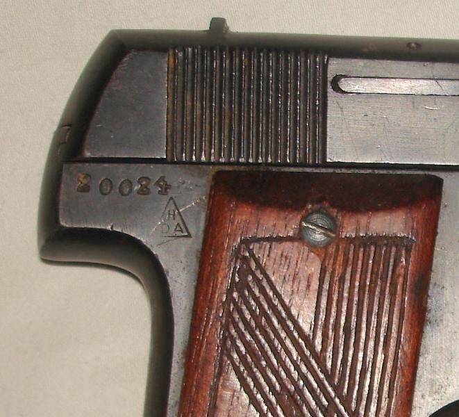 Hola,buenas:Se trata de una pistola "eibarresa" tipo "ruby".El logotipo que se puede apreciar en la parte trasera derecha es un triángulo con las letras H D A en su interior.¿Sabeis a que fabricante pertenecen?