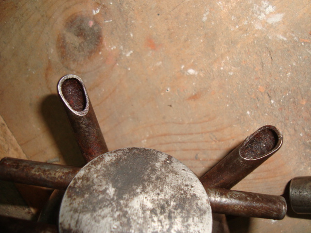 mas detalles, al desarmarlo en dos, las dos mitades ajustan bien, pero claro, son de hierro, asi que liquido o gas se saldrian al no llevar alguna junta de goma. las 4 patas van huecas y se comunican con la gran bola, pero los 6 tubitos mas pequeños no, estos 6 tubitos se comunican, los 2 de la izquierda con el de la izquierda de los de arriba, y los 2 de la derecha con el otro de arriba de la derecha