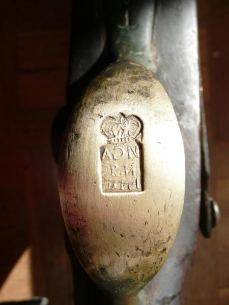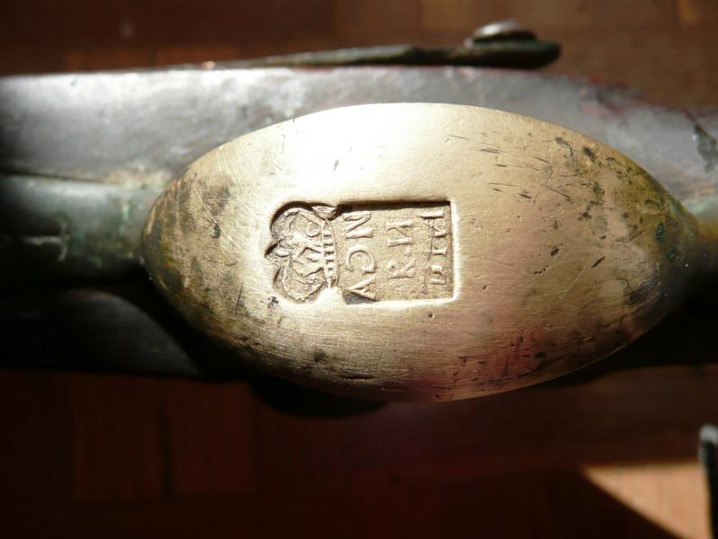 Es un arma centenaria de avancarga y en el guardamanos tiene este sello, no he encontrado referencias a él, en una ocasión me dijeron que creian que era el sello de mosquetero o arcabucero real.