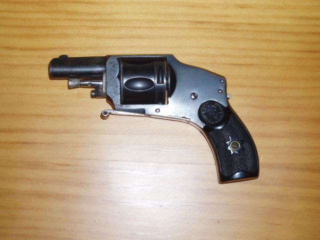 Hasta donde he llegado es que es un revolver velo-dog, de principios del s.XX, pero no he podido identificar el logo, parece una A y una E (¿armerias eibar?) no tengo ni idea, igual estoy diciendo una blasfemia, ruego que me perdoneis.