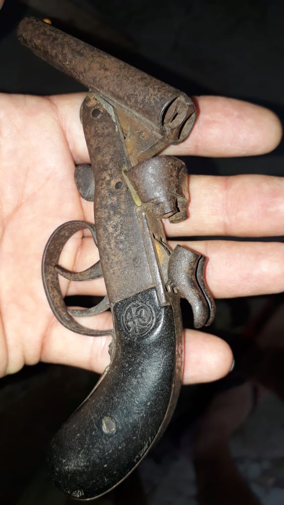 Es una pistola de dos cañones de fuego central y anima lisa. Por su estado diria que eibarresa, aunque tambien se fabricaban en francia y sobre todo Belgica. Disparaban los cartuchos de 9 mm y las mas grandes incluso el 12 mm. Tambien he visto que las habia del .22 (cartuchitos) pero no se si en fuego central o anular.