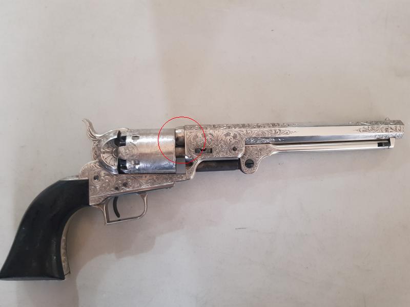 Otros detalles, veo que en el tambor esta grabada la fecha de la batalla de Campeche, que es la fecha de la batalla naval que suelen llevar los colt 1851 norteamericanos, sin embargo no veo grabado en ese tambor el numero de patente, el cual debería ir grabado en horizontal. Del mismo modo, la grabación del cañón no es correcta, en ella debería poner: Address Col. Saml Colt New-York US America.