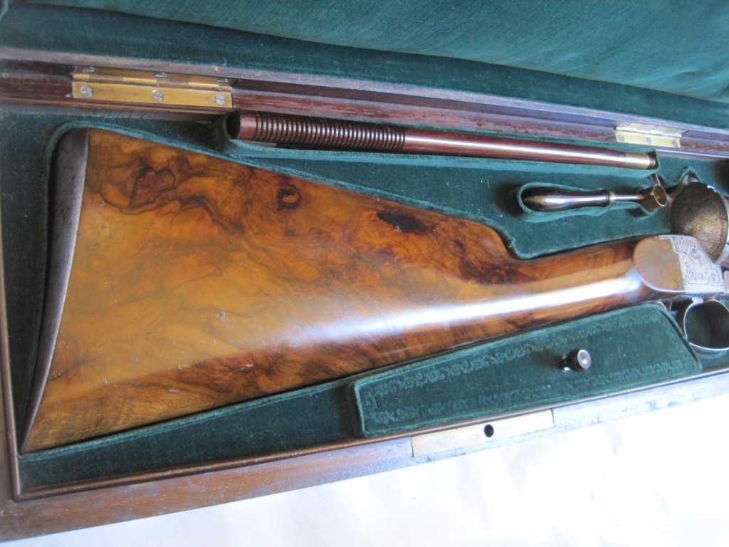 Arma de fabricada en Paris entre 1860 y 1867, carabina con estuche con todos sus accesorios para regalo o hecha por encargo, todo en perfecto estado, no he vivido tantos años pero aun así, aseguraría de que no se ha disparado por el perfecto estado, tanto del arma como del los accesorios……. cañon de 14 mm de diametro.