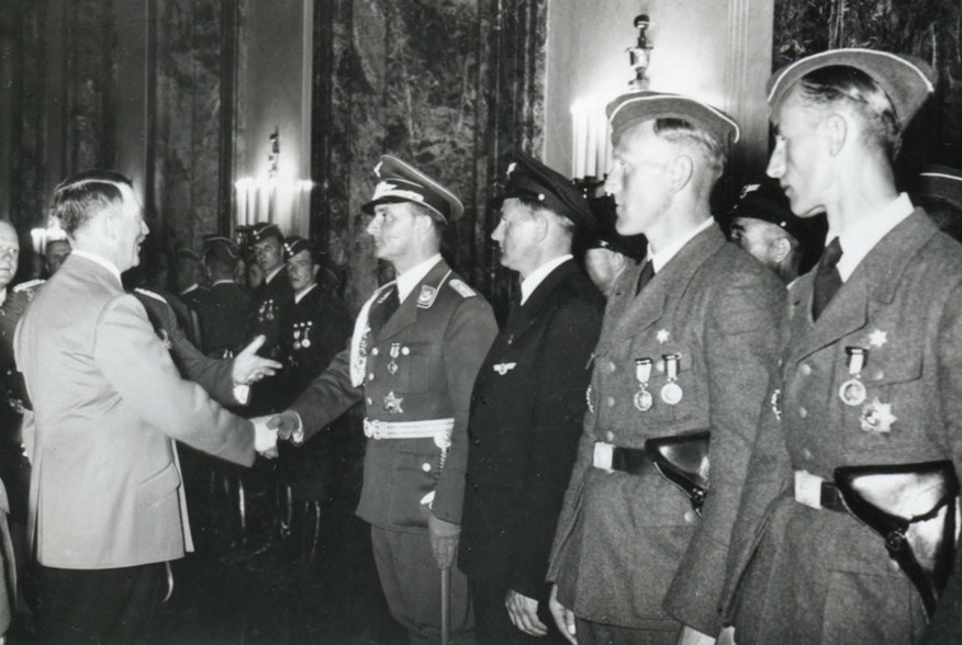 En estas dos fotografías, tomadas también en Alemania y vistiendo uniformes españoles con sus Luger al cinto, lo destacado son los personajes que saludan a los miembros de la Legión Cóndor.