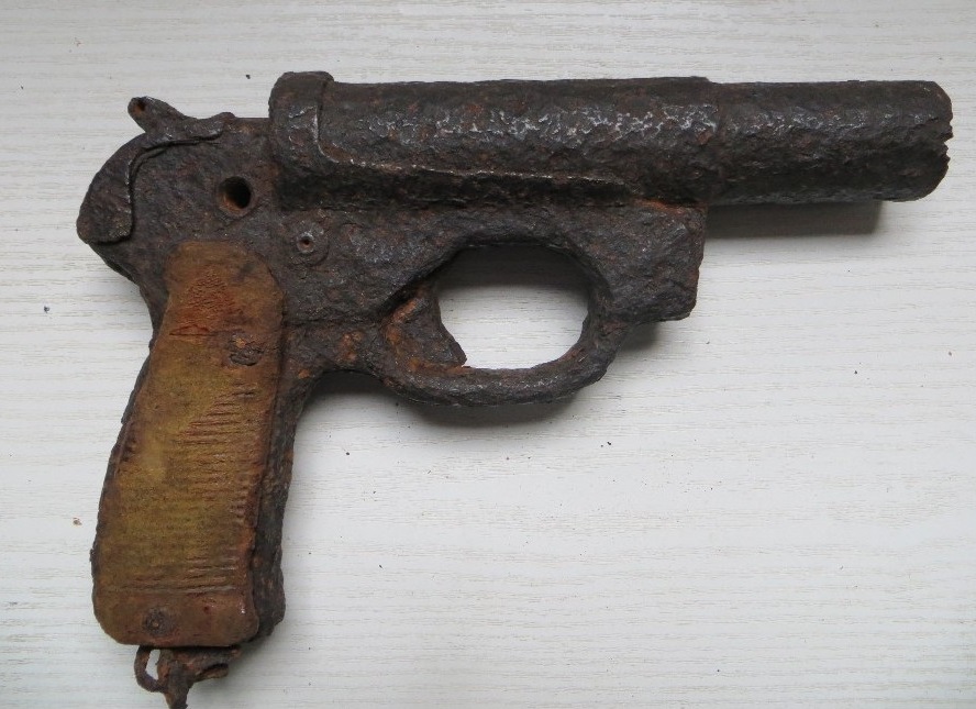 Uff... de ésta no sé, pero, no obstante... ese dibujo de las cachas... me recuerda algo: está presente en las empuñaduras, las cachas, de muchas pistolas que podemos situar "a la izquierda", algo así como una especie de seña de identidad de modelos "soviéticos"