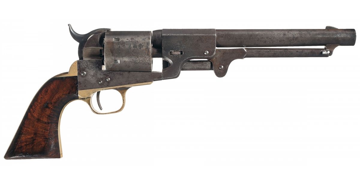 El revólver que lleva es una copia del Colt Dragoon fabricada en Texas para los Confederados por la firma Dance Brothers en calibre .44.