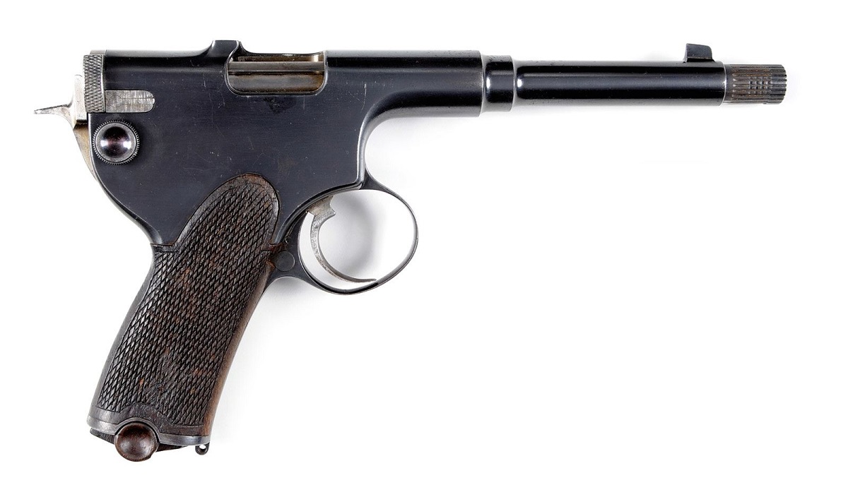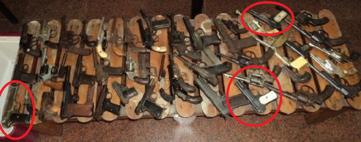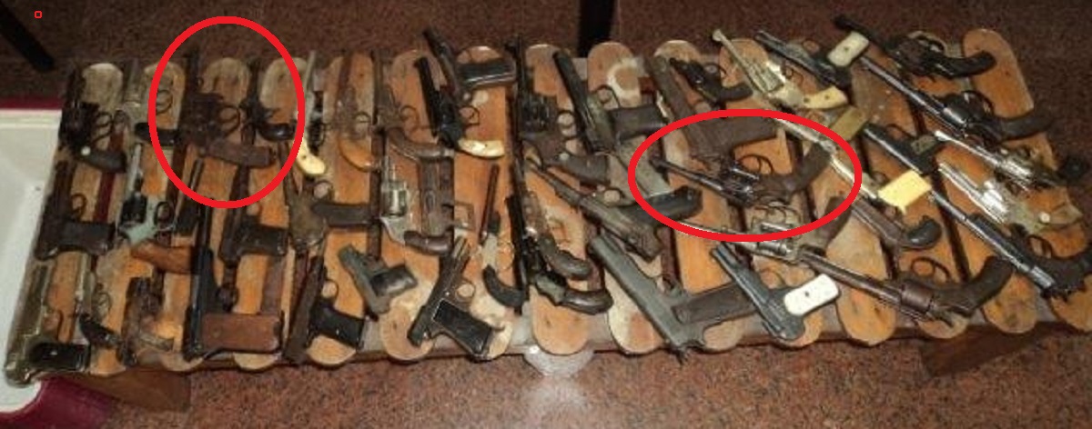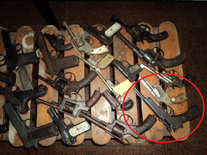 Pistola Seyr 1905, Steyr 1911, Colt 1911 A1, Remington Double Cannon, FN 1900, Luger Ary con cañón recortado, Campogiro, Beretta 1935 o 1935. Revolver Nagant….