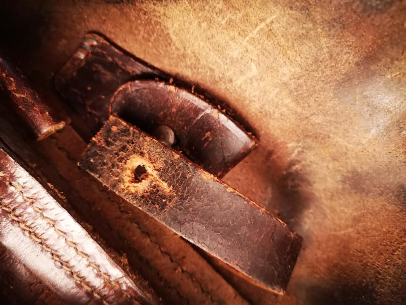 Las trabillas traseras han sido cambiadas en época y han envejecido muy mal. La bolsita portaherramienta se cambió, pero fue una total chapuza. Falta la tapa.