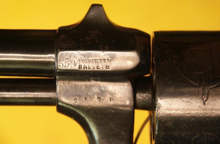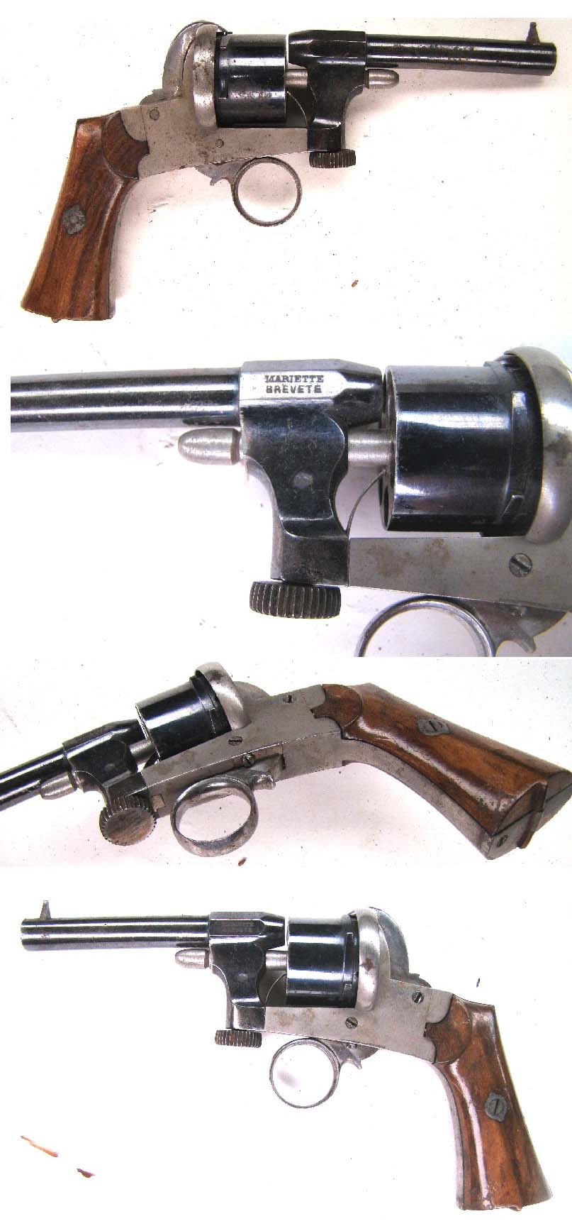 Se trata de un revolver Mariette belga, en simple y doble acción. Lo interesante de esta pieza es su sistema de apertura, además de la escasez de estas armas. Es un tipo de arma muy cotizada y rara en Bélgica.