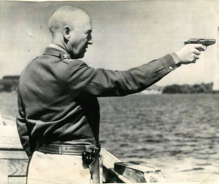 Parece el General Patton probando una PPK...Pero no lleva su Colt con cachas de marfil, que no de nácar, que eso era para señoritas de mala fama...