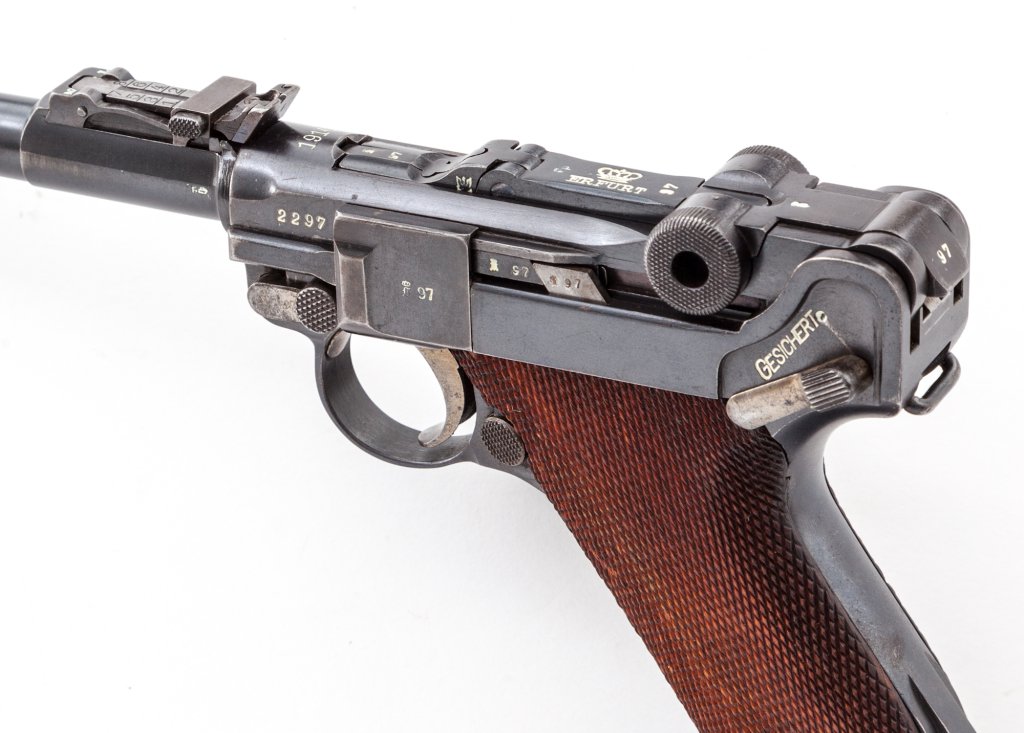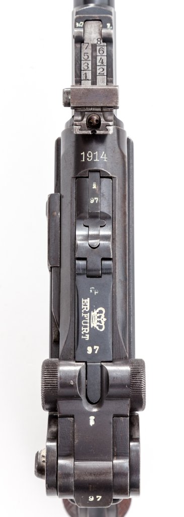 "To accomodate the tangent rear sight, a step was machined in the receiver top. This step was thereafter (starting November 1916) machined on most Erfurts P08's, resulting in interchangeability between the two models, thus simplifying the manufacturing process"[/i]
