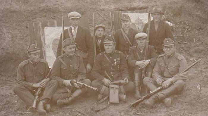 Es que ya de por sí la foto no era buena y ha perdido con el trasvase...pero el 2º, el 4º y el 5º por la izda llevan unas características fundas negras de pistola, que se vieron hasta hace bien poco, sumado a las bandoleras para peines, dan idea de su origen y de lo que puede haber dentro...