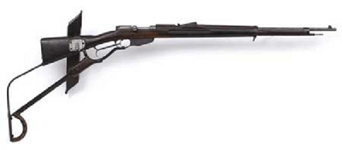 el artilugio es un periscopio para poder disparar el arma desde dentro de la trinchera y el arma diria que es un mannlicher M.95 Loopgraafgeweer. Fue utilizado por Austria y Hungria principalmente, pero tambien por Bulgaria, Checoslovaquia, Alemania, Grecia, Italia, Holanda, Imperio Otomano, Polonia, Portugal, Rumania y Yugoslavia