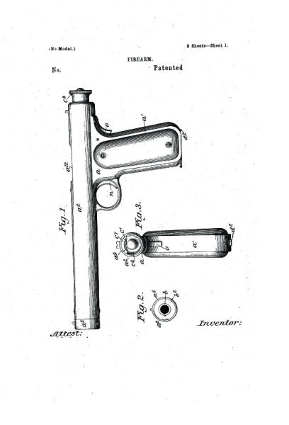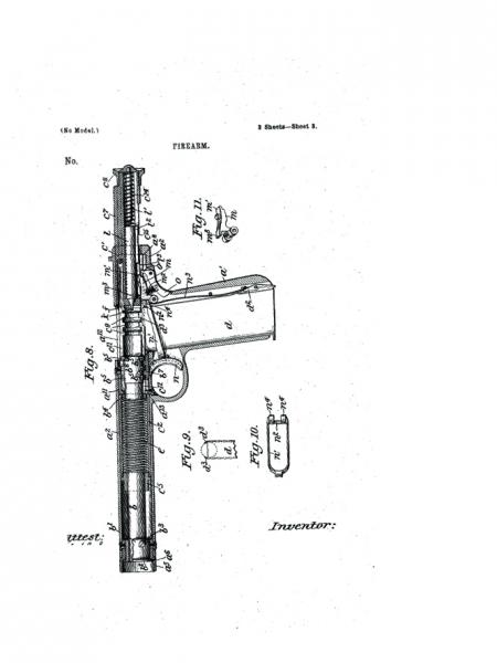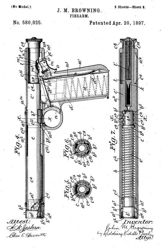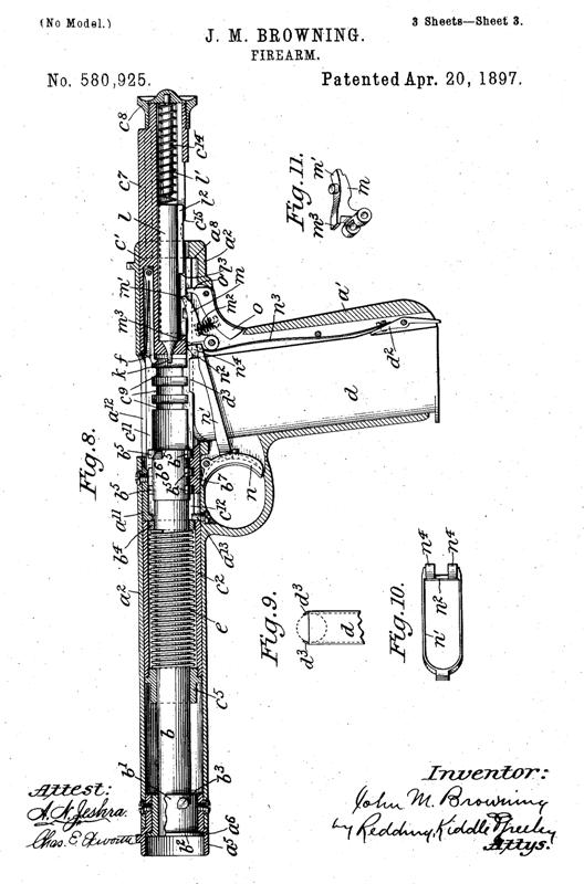Aquí vemos la introducción de la seguridad de agarre popular que ha encontrado su camino en los diseños de muchos de pistola desde 1897. John Browning utilizó la ronda de calibre .38 ACP de nuevo para esta pistola semi-automática. Otra característica que se introdujo con esta patente era un sistema de retroceso de bloqueo. Un rápido vistazo al dibujo de la patente y te darás cuenta de este diseño se destaca en comparación con sus otros diseños. Colt comprado este diseño y lo probó, pero nunca se avanzó en la producción. El diseño ganó John Moses Browning Patente de EE.UU. 580.925 el 20 de abril de 1897. Él había solicitado esta patente el 31 de octubre de 1896.