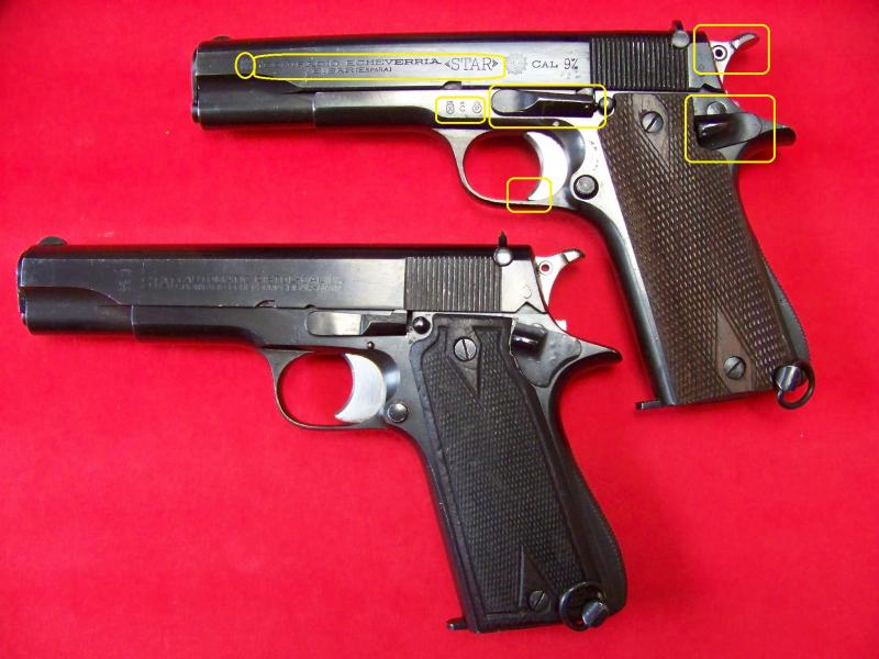 Principales diferencias externas, resaltadas (me ha faltado marcar la diferente escotadura en la corredera para la palanca del seguro manual, bastante más pequeña en la primera)
