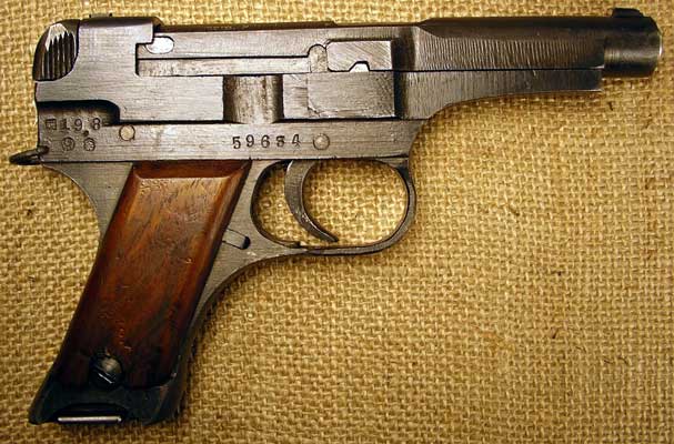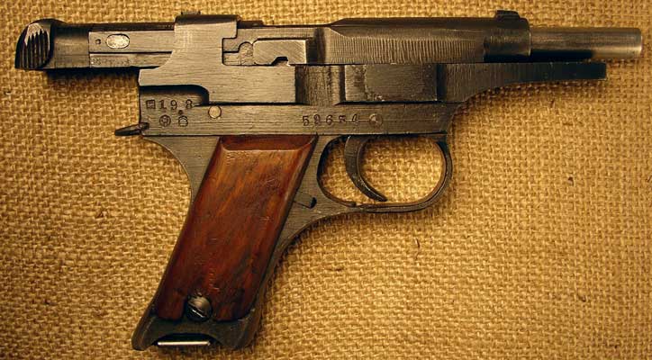 la pistola que citas es una Japonesa Type 94 de 8x21 ,5 Nambu fabricada por la Nambu Rifle Mfg .Co , desarrolada en 1929 y se puso en produccion en 1935 cesando esta en 1945 , se calcula que se fabricaron unas 70.000 unidades