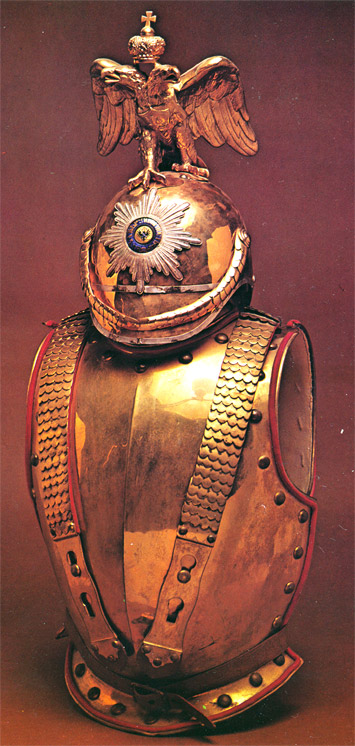 Los tres que están de pie son Coraceros del llamado Regimiento de Guardias Caballeros (Chevalier Guards) con sus característicos cascos con el águila bicéfala coronada.