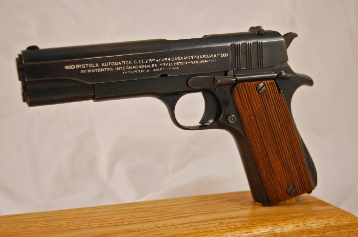 En 1927, Argentina había adoptado como pistola reglamentaria la Colt 1911 A1,en calibre.45, comprando 10000 ejemplares y consiguiendo asimismo la licencia de fabricación; las empieza a fabricar en la fábrica estatal de Rosario, llegando a producir 74866 a lo largo de décadas.
