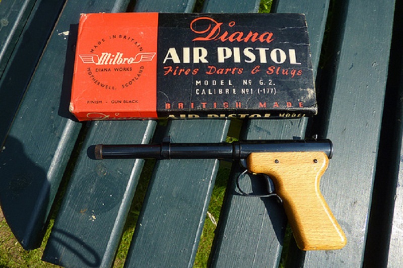 La primera es francamente rebuscada y se trata de una pistola de aire británica Milbro Diana Mod.2 de los años 50 y 60 muy similar a esta de la foto.
