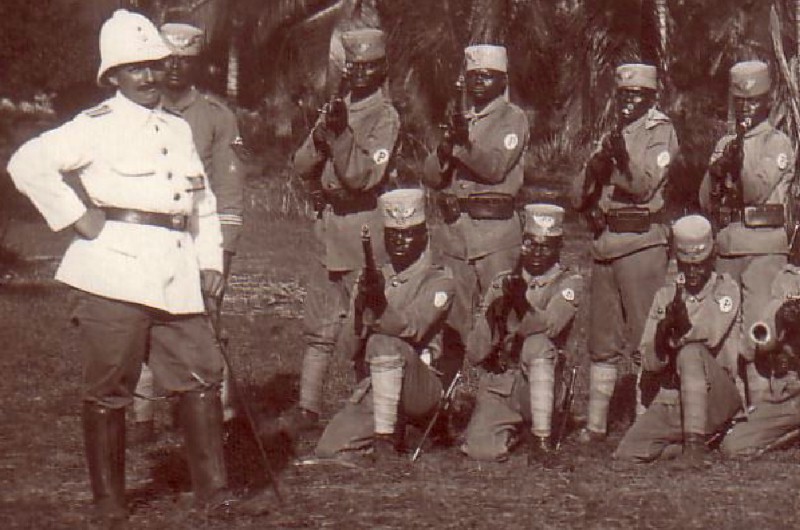 El segundo en acertar es oteflo en cuanto a definir las tropas como Askaris. Eran tropas de policía indigenas, con mandos alemanes. Y el detalle que citas es correcto. En la película "Memorias de Africa", cuando los hombres se van a la guerra, es contra esas tropas, en el sur de Kenya.