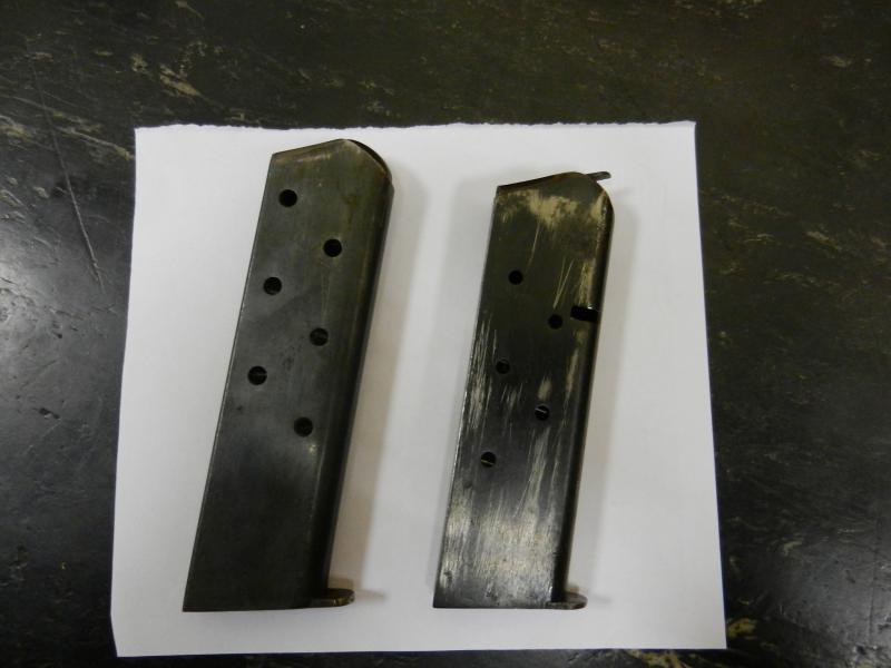 desde Littlegun, Bélgica, hacen una pregunta acerca de unos cargadores del calibre .45 y presentan 2 fotos; uno es de una Colt .45, evidentemente, y otro cargador, más largo, y con una teja redondeada. Quieren saber para qué arma pudo ser fabricado ese cargador. Adjunto fotos. Dicen que pueden remitir fotos de detalle si se piden.
