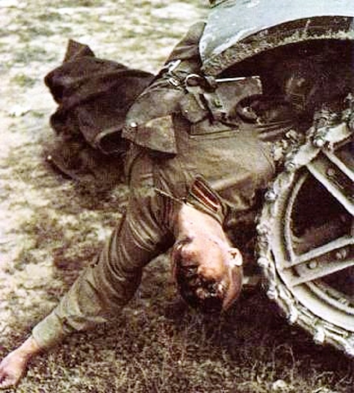 Por último vamos a ver quién sabe decirnos qué arma llevaba este pobre desgraciado protagonista de esta durísima imagen de guerra.