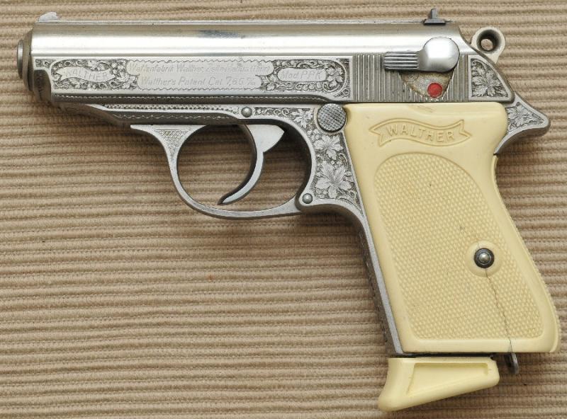 Estas armas labradas y de cachas blancas eran pistolas de encargo y representación y muchas de ellas fueron encontradas en la propia factoría Walther cuando esta fue ocupada por los americanos.