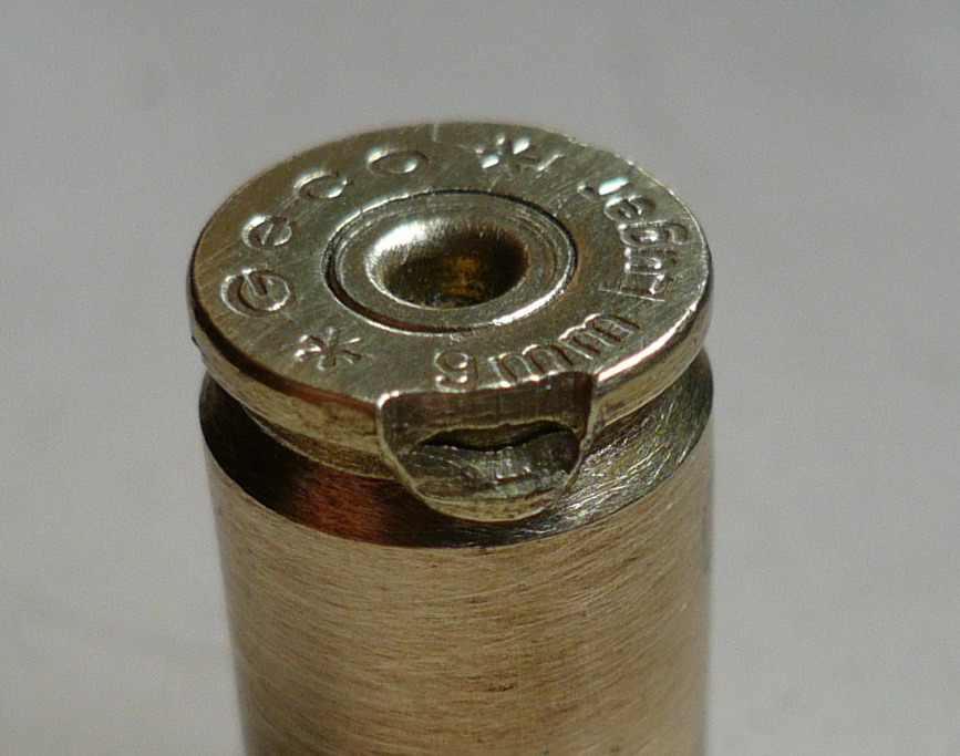 El cartucho del centro es de 9 largo original y presenta un picotazo absolutamente normal.