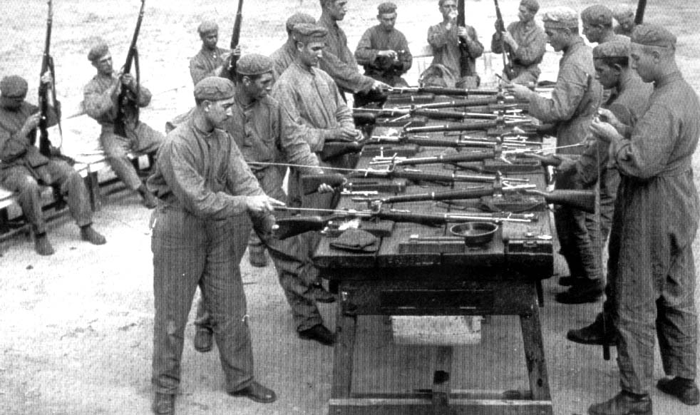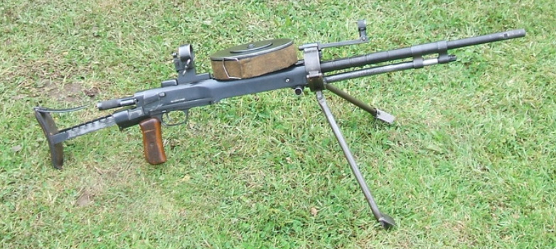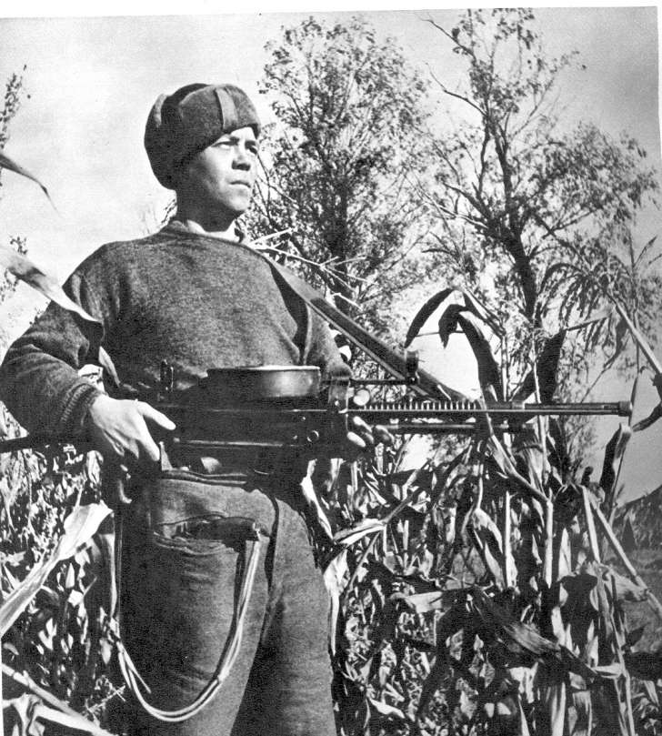 Se ven dos armas soviéticas, un fusil Mosin Nagant 91/30 y una ametralladora DT-29.