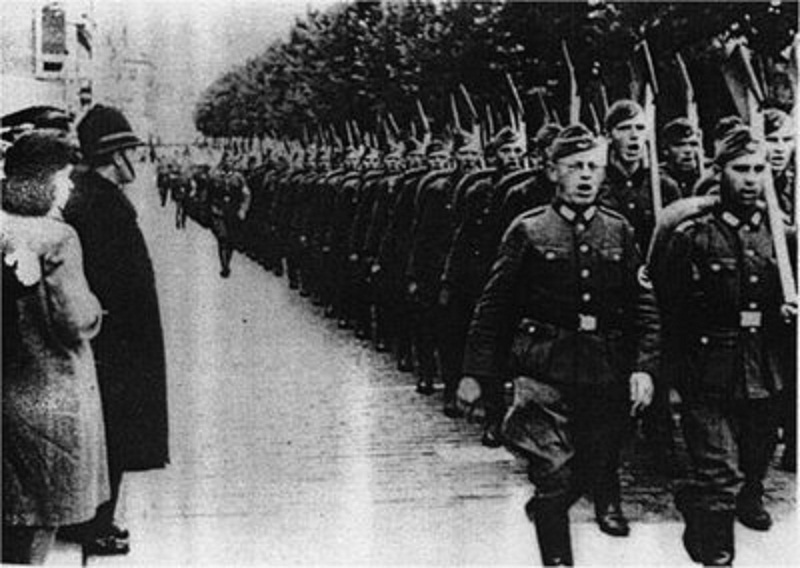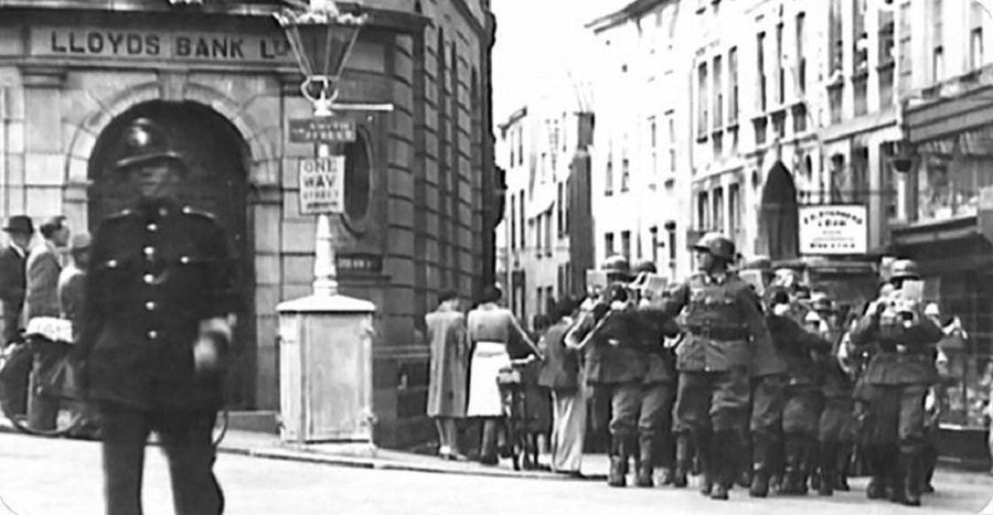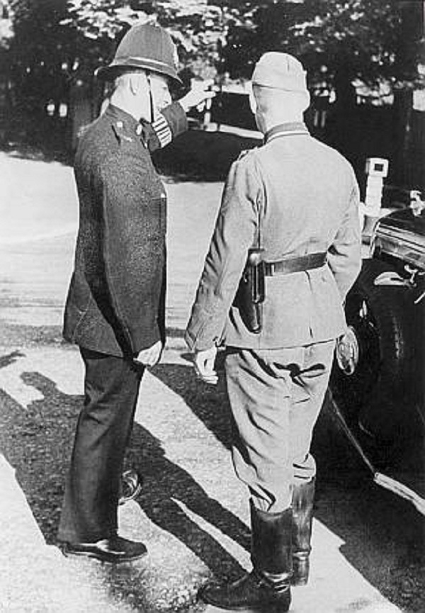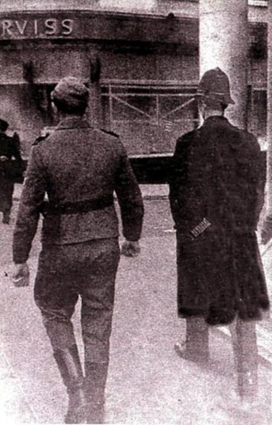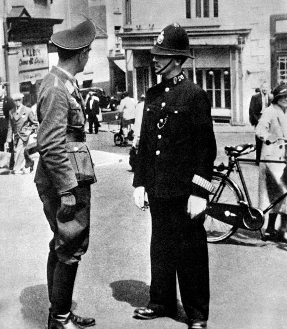 Armas no hay muchas que identificar pero... ¿Quién puede explicar y donde podemos situar geográficamente estas imágenes en las que vemos convivir en aparente armonía a Bobbys británicos con soldados y oficiales del Ejército del III Reich?