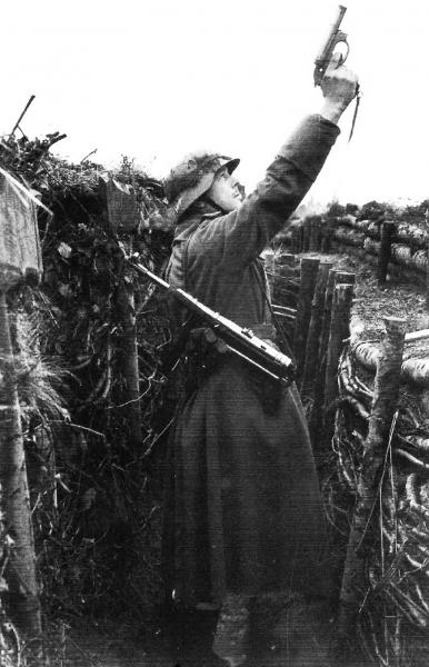 Subfusil MP-40 al hombro, y pistola lanzabengalas LP-42 (Leuchtpistole 42) en la mano.