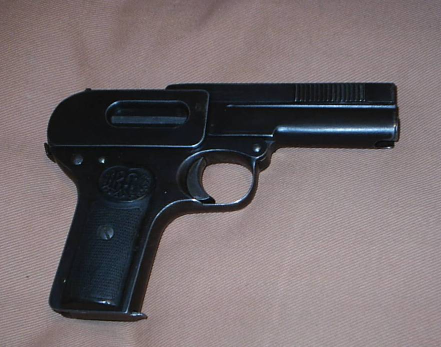 Es una pistola danesa Schoube , seguramente por el gran tamaño una modelo 1907 , un raro engendro que disparaba proyectiles del calibre 11mm de madera con cubierta de metal. efectivamente una de las pistlas mas raras del mundo.