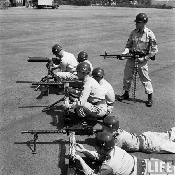 Esta bonita foto, seguramente de mediados de los 60, es un compendio de ametralladoras medias americanas: Browning M1917 refrigerada por agua y M1919, versión normal con trípode y ligera A6 con bípode y culata, y su sucesora, la M60.