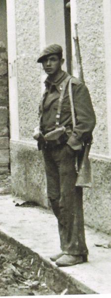 Podria ser un miembro del tercio de requetés, en la guerra civil española. Lleva una boina sin emblema y en la solapa, lleva emblema de artilleria. El fusil puede ser un Mauser español, modelo Oviedo