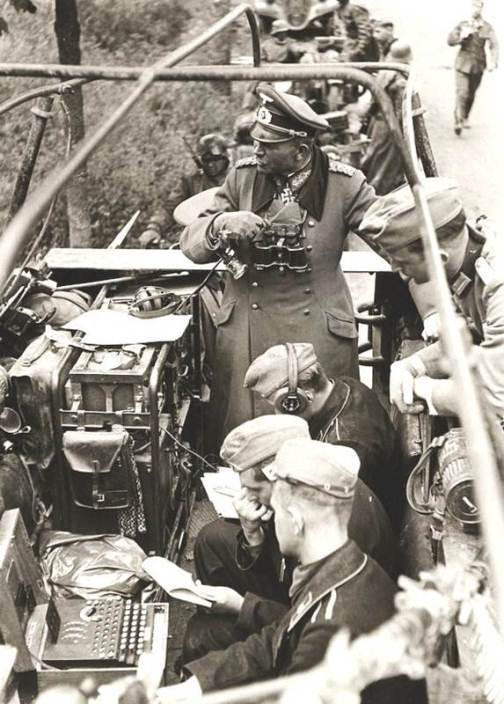 Aqui un general de la Wehrmacht en un vehiculo de mando, en primer plano, la Enigma.