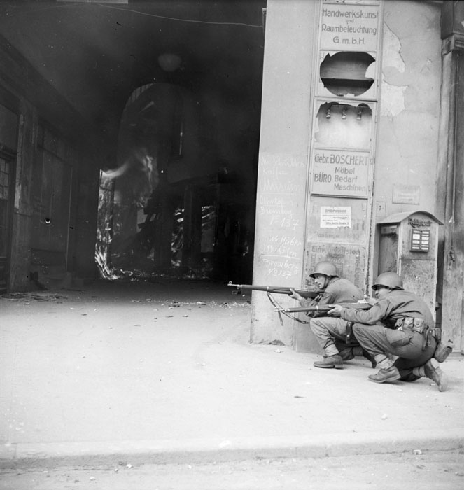 La segunda es una imagen trucada y falsa de la propaganda soviética hecha sobre la primera foto original a la que se sobrepusieron esos personajes NO REALES que escenificaban esa cruel escena NO REAL para que sus compatriotas creyeran que era cierta y aumentaran así su odio hacia los alemanes.