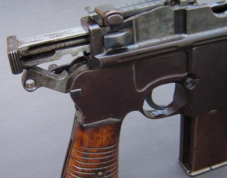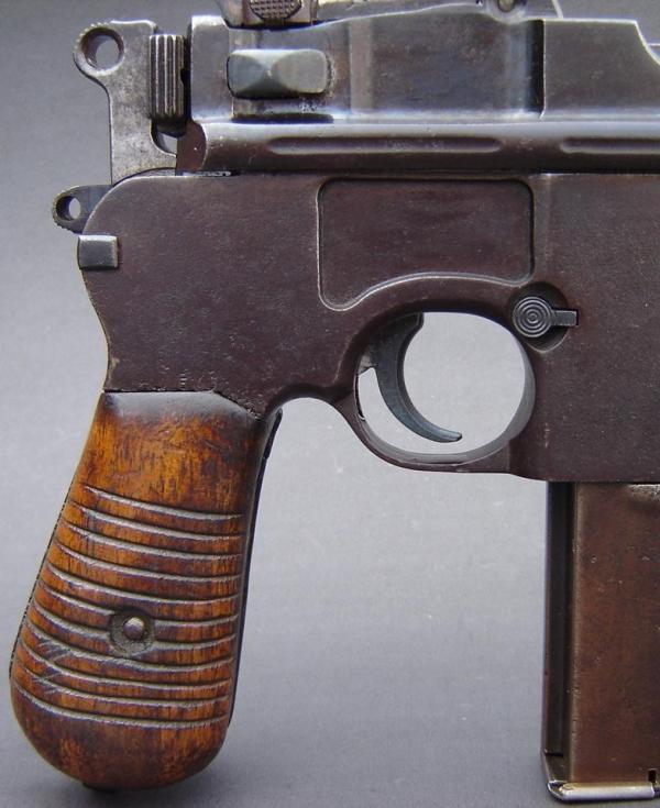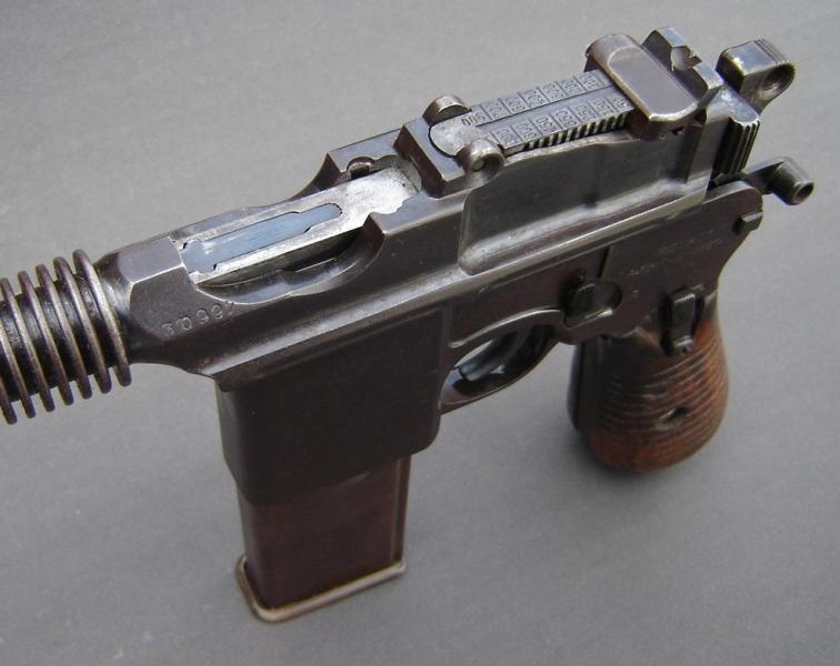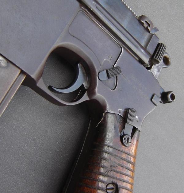 En la cacha de esta maltratada pistola tipo ruby parece adivinarse una cabeza de león enmarcada en un círculo de borde decorado típica de las pistola Benemérita, marca comercial con las que D.F. Ortega de Seija distribuyó en Madrid este tipo de pistolas eibarresas en calibre 6,36 y 7,65 mm.