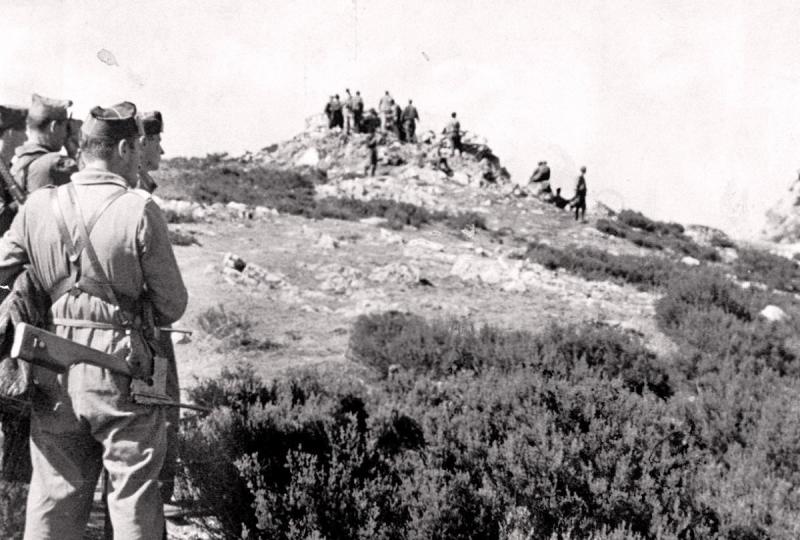 Estas tropas nacionales llegan a la cima de uno de los montes que rodean Oviedo desde donde alcanzan a ver el mar.
