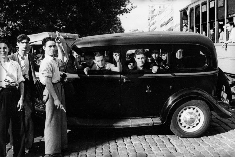 Creo que la fotografía es de Madrid. Si no me equivoco los taxis de la Capital antes llevaban una franja roja longitudinal de adelante a atrás como la que parece tener este que va lleno de "milicianos de ciudad".