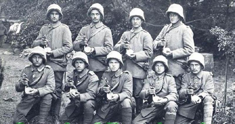 Una colección de Lange Pistole '08, más conocidas como "Luger de artilleria", provistas de cargador de caracol con capacidad para 32 cartuchos, y esta vez en manos de "StormTruppe" alemanas.