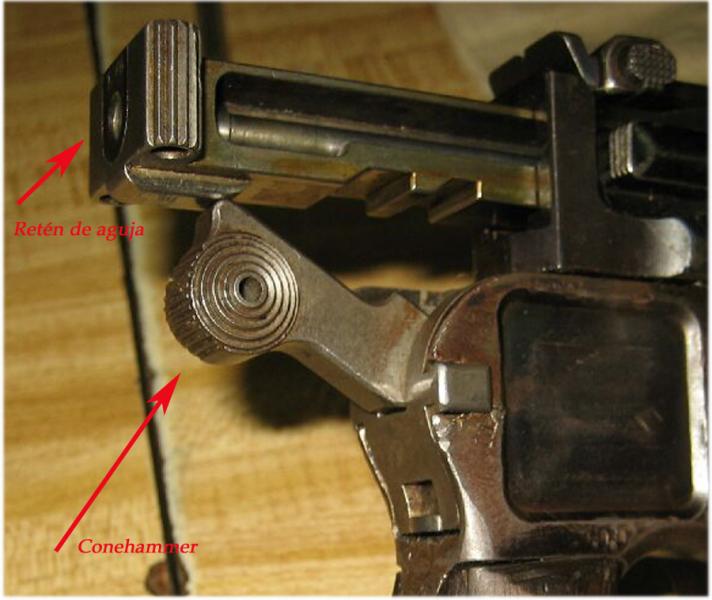 Los Conehammer llevaban en la parte posterior del cierre una pieza, encajada a cola de milano que servía de retén para la aguja percutora.