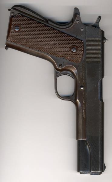 Según todas estas características sólo puede ser una 1911A1, bien en su versión militar U.S. Army en este caso con unas cachas de madera con los diamantes o bien una 1911A1 comercial llamada Government Model también con ese tipo de cacha.