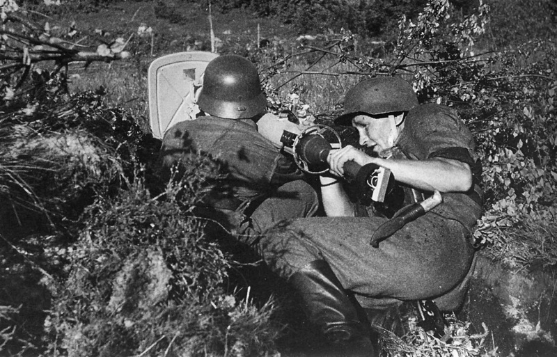 Las tropas son de la SS, y las armas que portan son el "Panzerschreck" ó "Terror de los Panzers" y el subfusil Bergman MP-35.