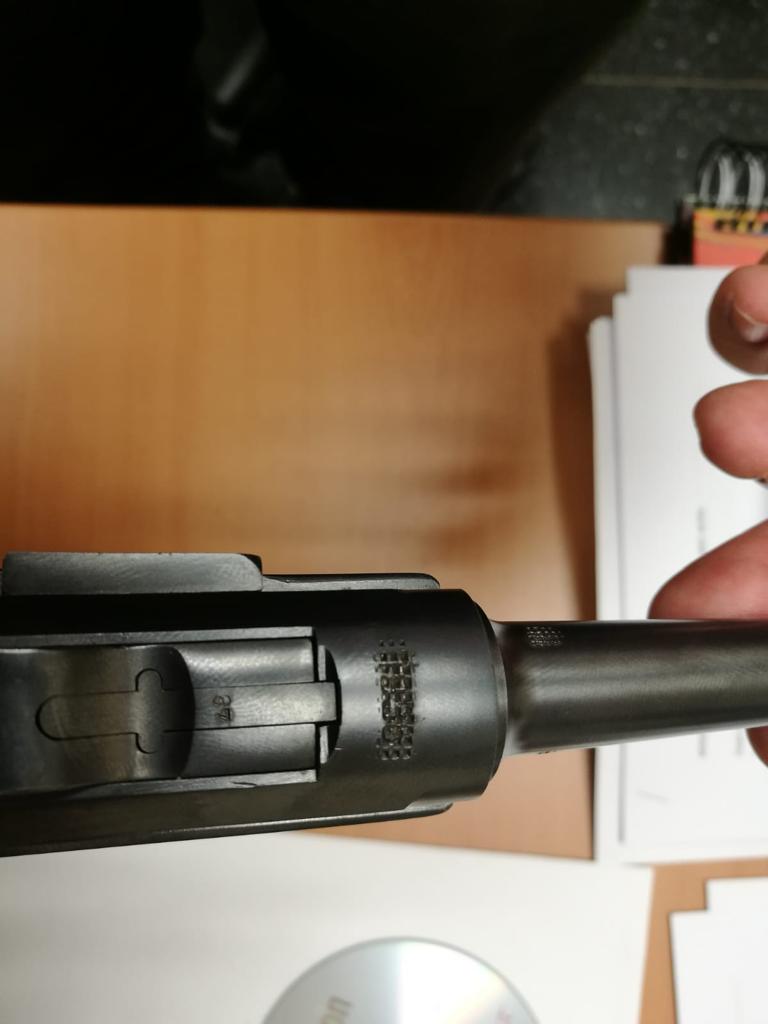 Tambien me resulta un poco raro que la pistola no tiene el rail para colocar el culatín y un numero de serie de 4 cifras.