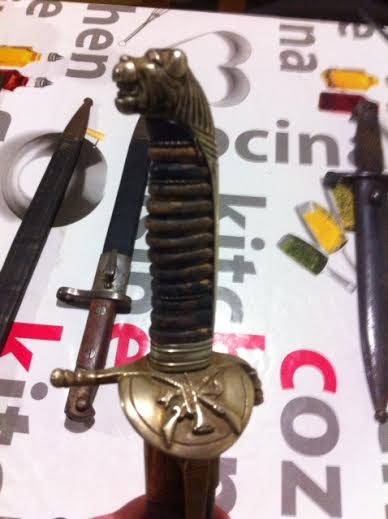 La cuestión es que las hirschfanger suelen presentar adornos con forma de concha, y en la que nos muestras aparece un escudo de armas, escudo que no es coincidente (creo que no me equivoco) con alguno de Europa central, con lo que el aprovechamiento de un sable militar quedaría descartado, ¿entonces que es?, pues creo que se trata de un espadín de cadete, aunque aquí la llamaríamos daga, por el escudo juraría que es del ejercito mexicano, los mas habituales tienen forma de cabeza de águila, pero los de la academia miltarizada de Mexico tienen forma de cabeza de jaguar. La empuñadura de los espadines actuales es de color blanco, ignoro si antes era de otro color, o si tal vez el paso del tiempo halla deteriorado la pieza.