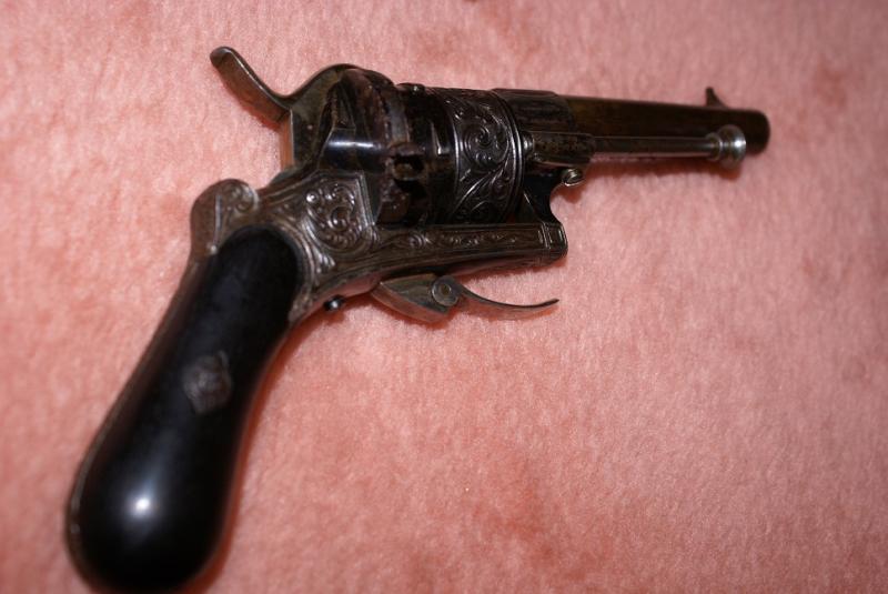 Es un trabajado revólver Lefaucheux fabricado casi con toda seguridad en Bélgica.