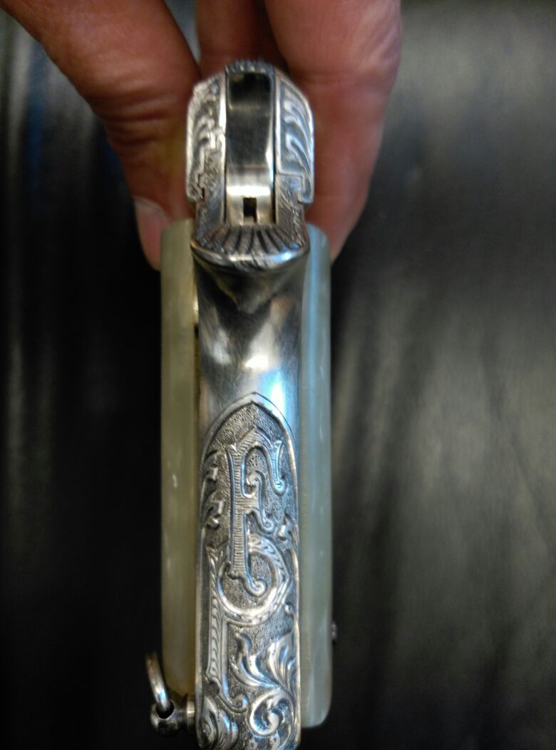 Se trata de una STAR S del Calibre 9 Corto (.380 ACP), con cachas de nacar, un cargador, y "cree y creo" que puede estar plateada. Lo que si esta es burilada y con unos detalles que no se si son "unicos" o al menos "poco comunes".